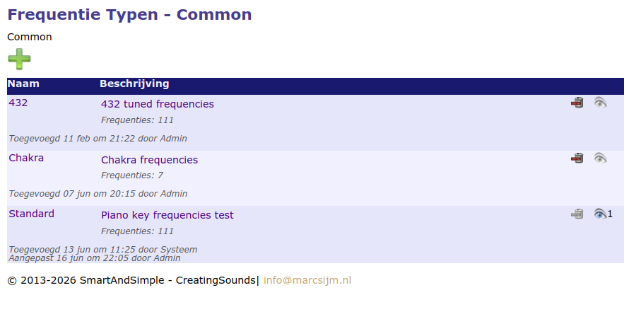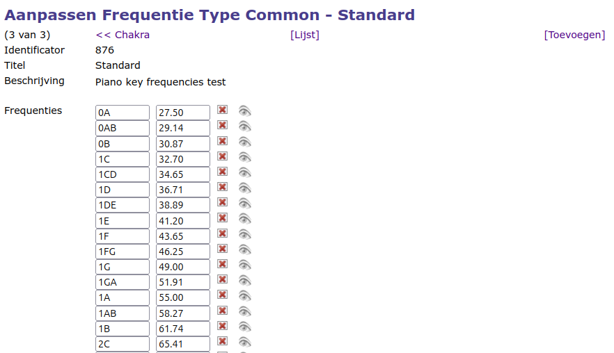 Deze pagina geeft de individuele frequenties met hun naam. De mogelijkhed wordt geboden deze aan te passen, te verwijderen en toe te voegen.